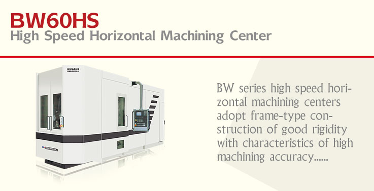 BW series high speed horizontal machining centers adopt frame-type construction of good rigidity with characteristics of high machining accuracy, good dynamic performance, high speed and fast tool changing etc. X, Y and Z-axis, connected with main frame directly and driven by adoption of linear roller cylinder guiding system and AC servomotor, can obtain rapid speed of 60m/min and accelerate speed of 10m/s2. The spindle is of high speed motor spindle with max. rotation speed of 16000r/min. The round type tool magazine, driven by AC servomotor, can accomplish auto tool changing action within 3.5 sec. Machines of this series are featured with high accuracy, high speed and high efficiency.