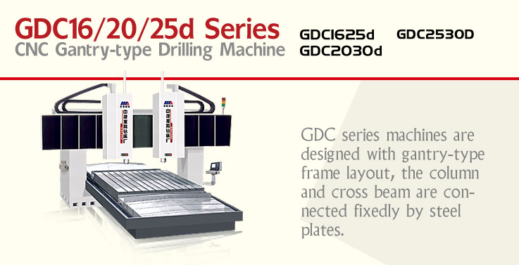 GDC series machines are designed with gantry-type frame layout, the column and cross beam are connected fixedly by assembled steel plates. The three axes of the machine are driven by ball screws of high accuracy. X-axis and Y-axis adopt precision linear rollers to maximization satisfy the requirements of drilling.