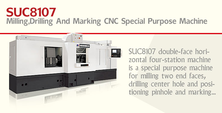 SUC8107 double-face horizontal four-station machine is a special purpose machine for milling two end faces, drilling center hole and positioning pinhole and marking, and also a parallel moving four-station machine applied to milling two end faces of camshafts, drilling center holes at two ends, drilling and reaming positioning pinholes at one end, and marking. Work-pieces are loaded manually then the following actions of positioning, clamping, milling end face, drilling center hole, drilling and reaming positioning pinhole etc. are to be automatically performed by the machine. After machining the positioning pinhole of the work-piece, the automatic sliding door on the top of the machine guard will open, the manipulator will grasp the work-piece and move horizontally to the left side of the machine, put on the marking table, clamp the work-piece and mark on it. After marking, the work-piece will automatically drop into the hopper. So far, the processing of the work-piece has been finished . The machining time is about 3 minutes. This machine is suitable for machining various camshafts and optical axes with work-piece length range from 450mm to 1000mm, as well as components need to finish the similar processes as mentioned above. It adopts integrated cast iron bed to get good rigidity, high machining accuracy and high automaticity, and also features lower labor intensity, convenient and user-friendly operation and adjustment, as well as suitable for large volume production.
